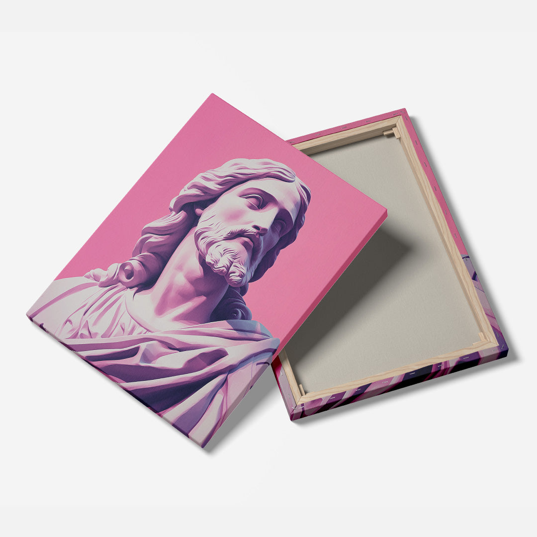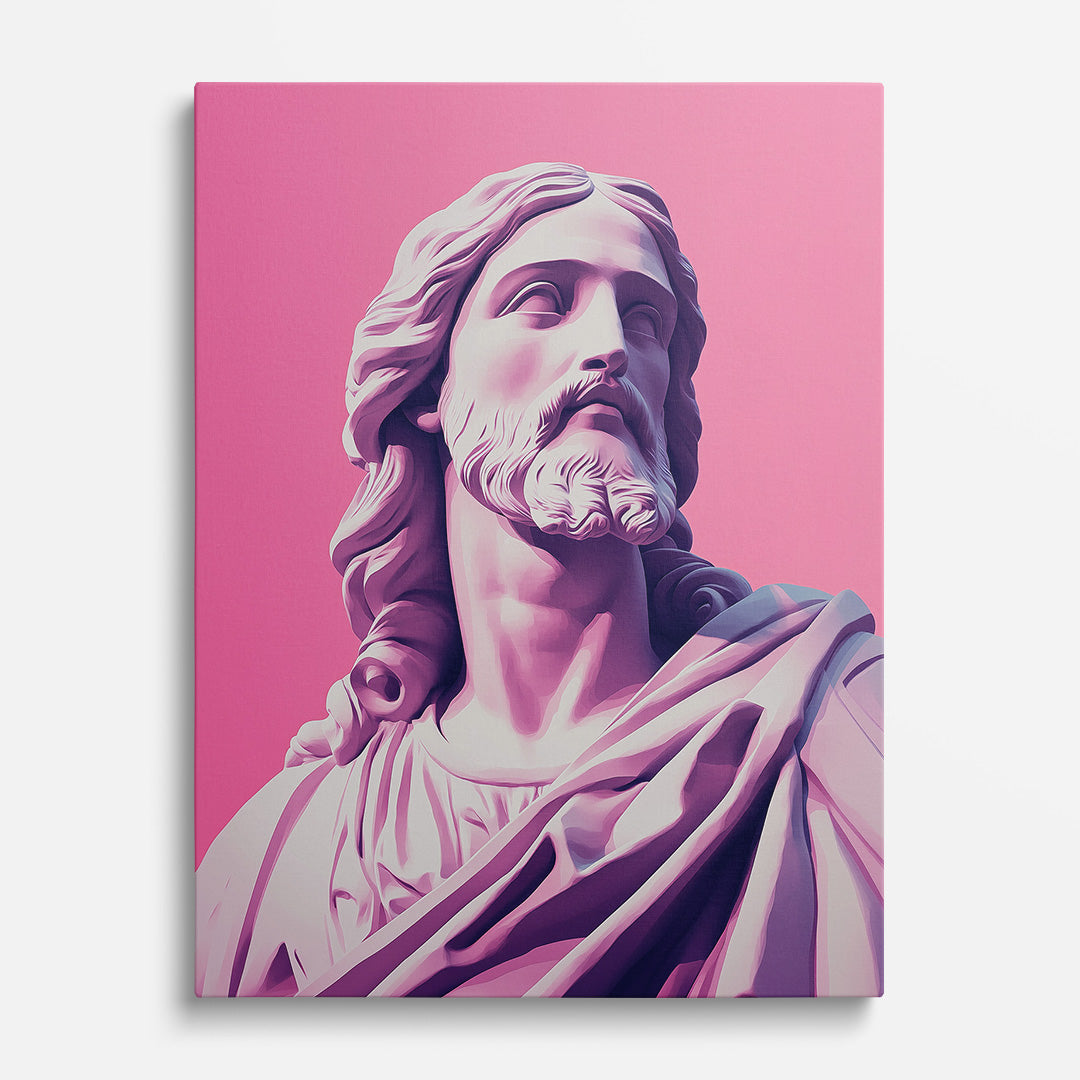 Bathed in pale pink, this sculpted Christ blends softness with strength.