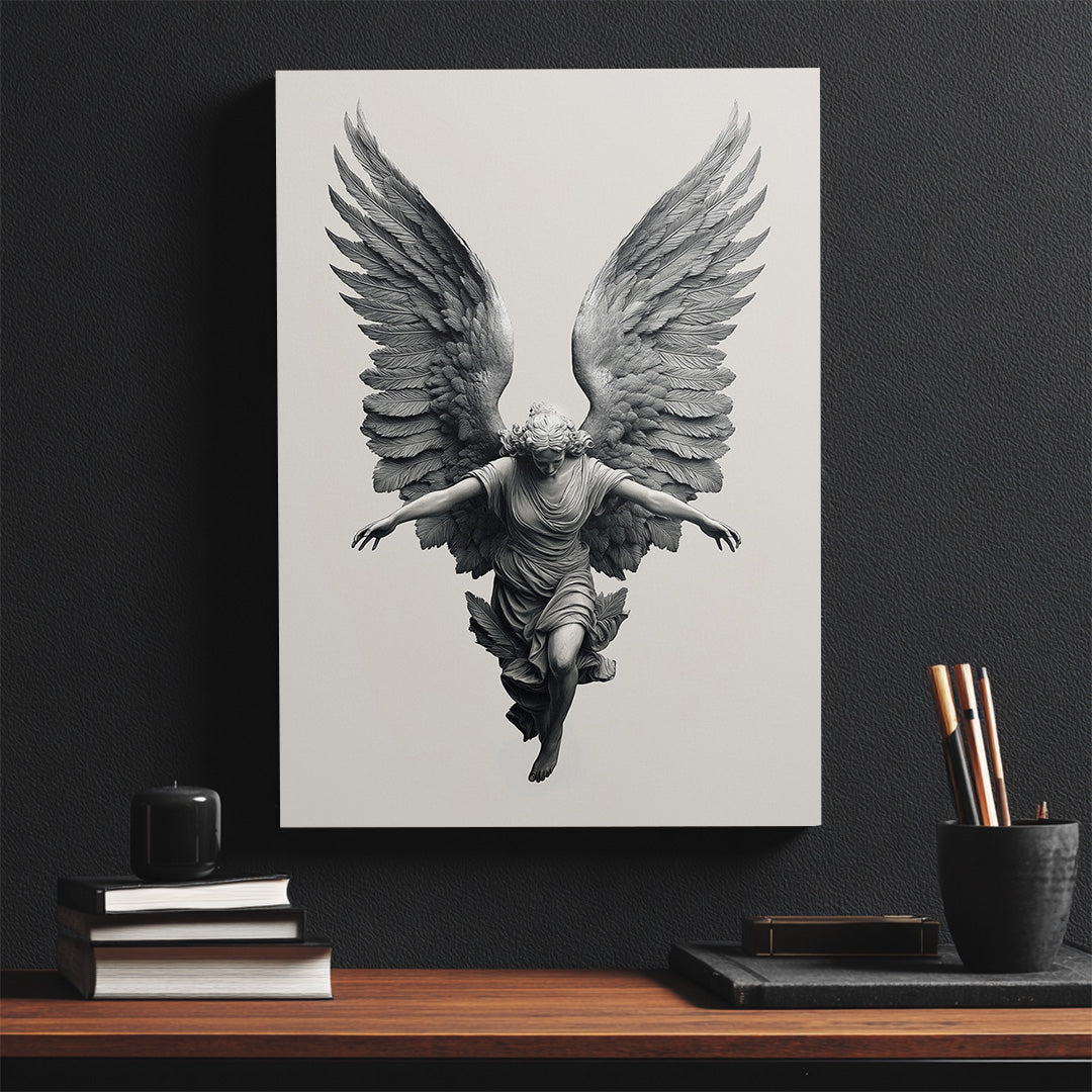 Wings outstretched, face blank in purity, posture prepared for war — this angel comes sent.